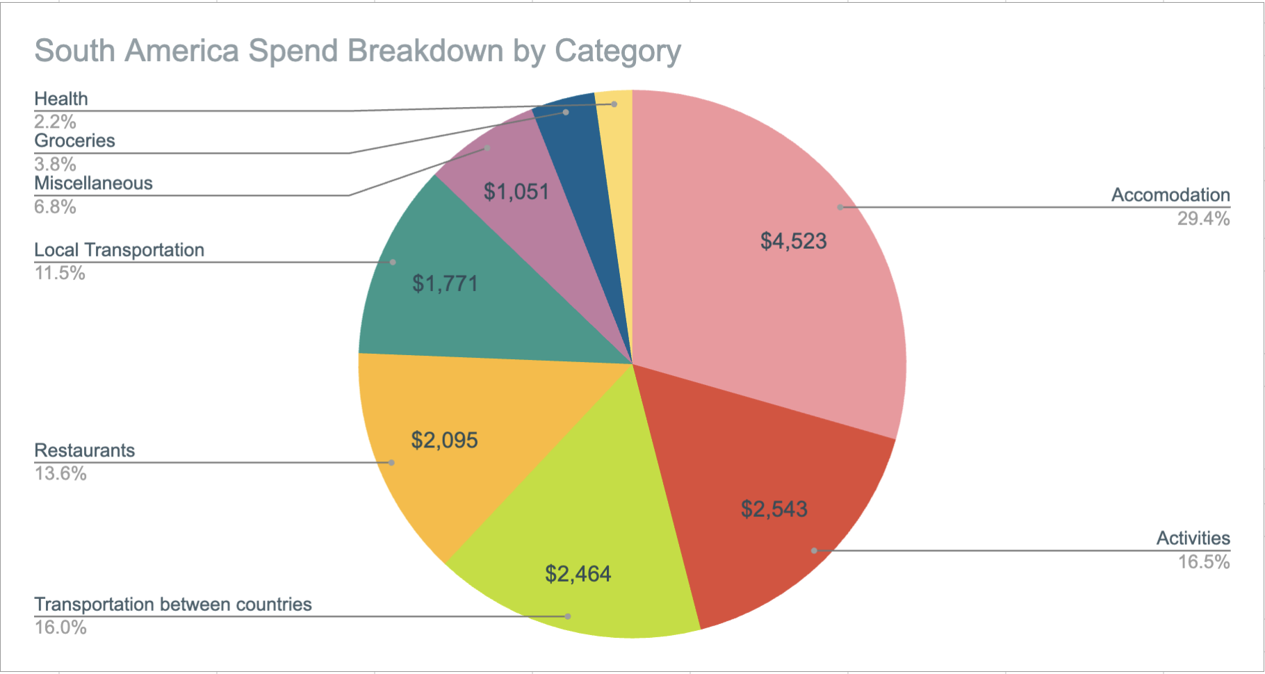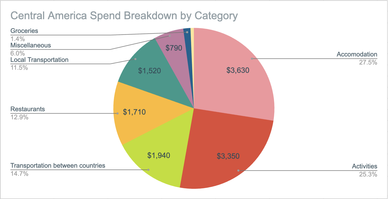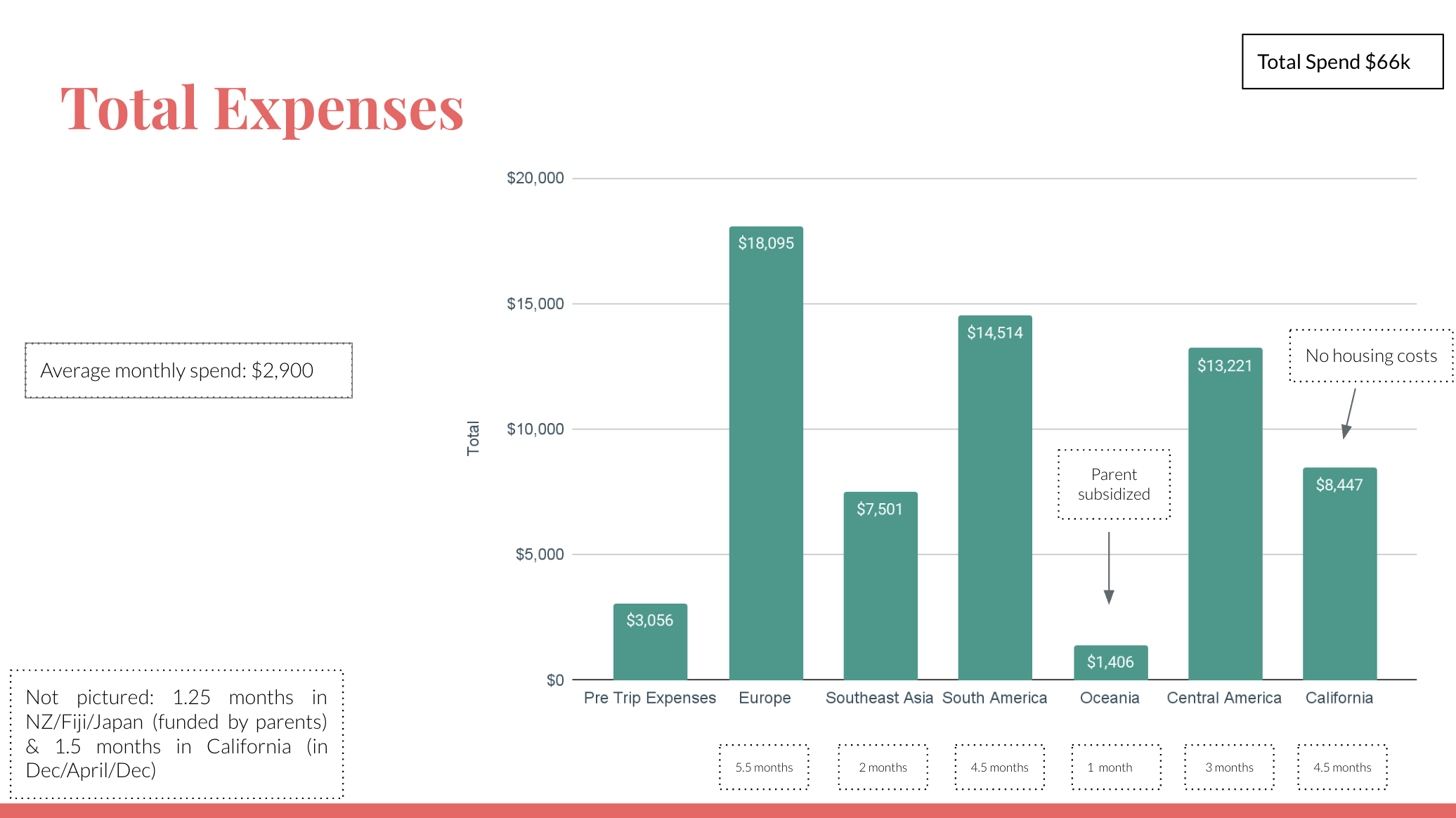 In full transparency, my parents kindly paid for Fiji, NZ, Australia, & Japan since I was with them for those four countries (very, very lucky!!) so this analysis will cover roughly 21 months (as the aforementioned countries were essentially free). This does include any spend I had while in CA, which is usually cheaper than traveling as I have no accommodation costs while at home.