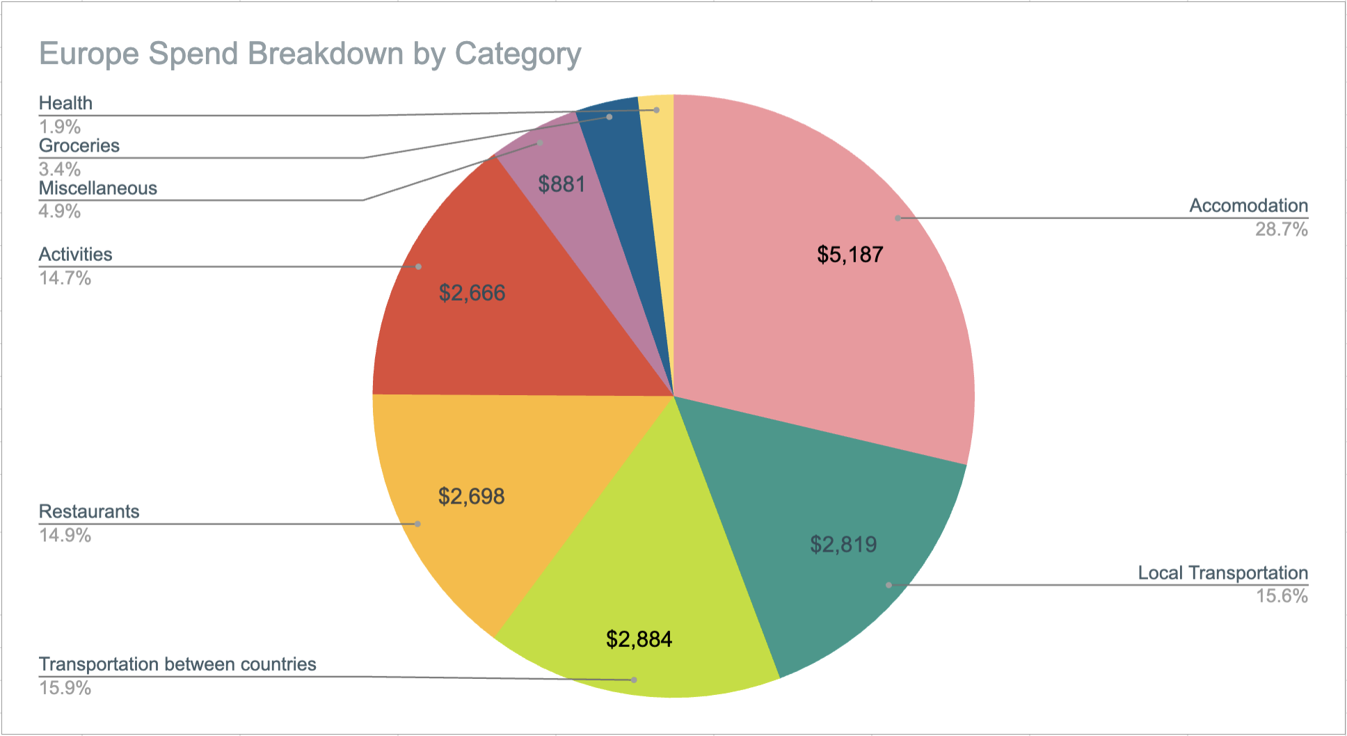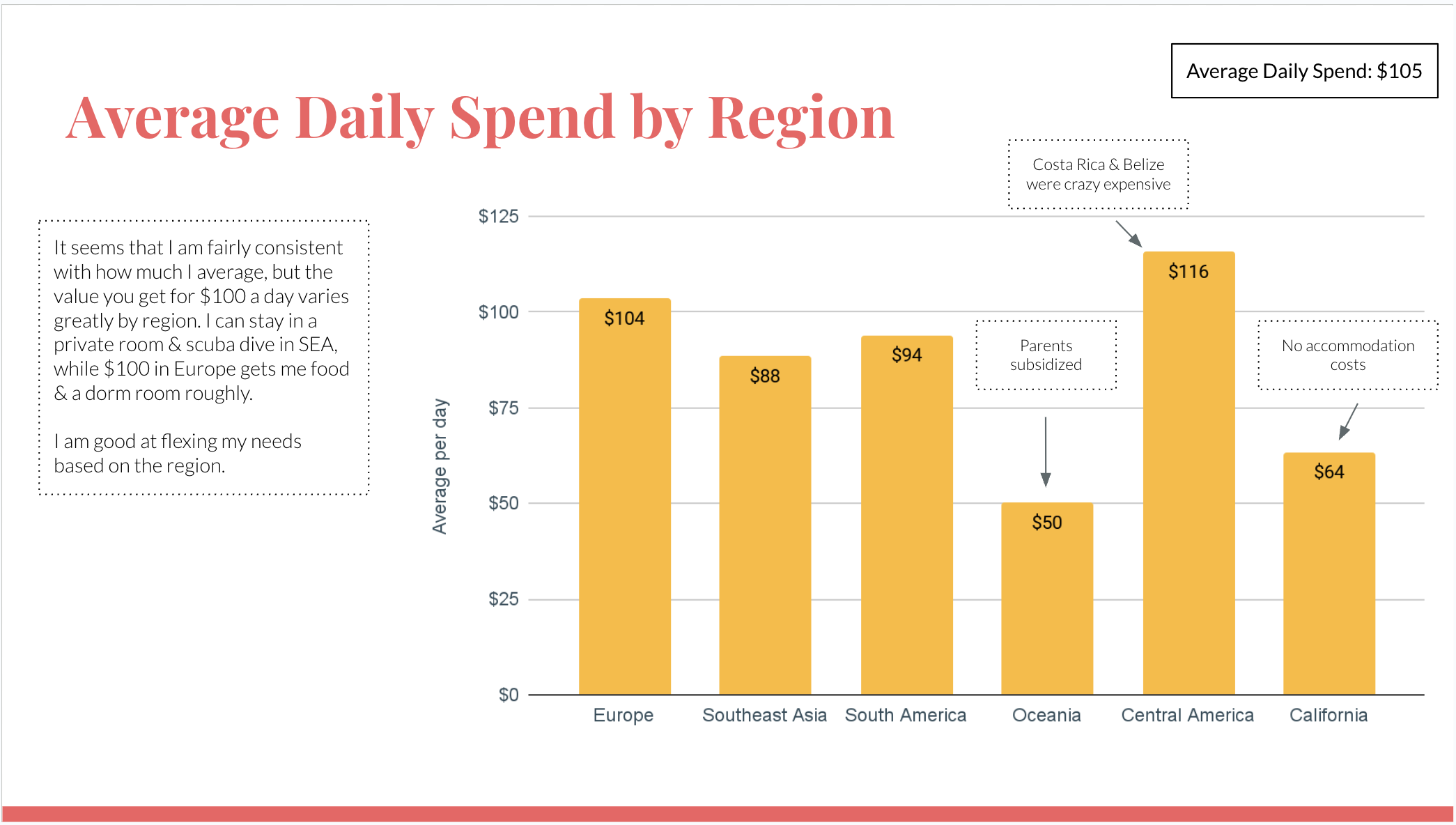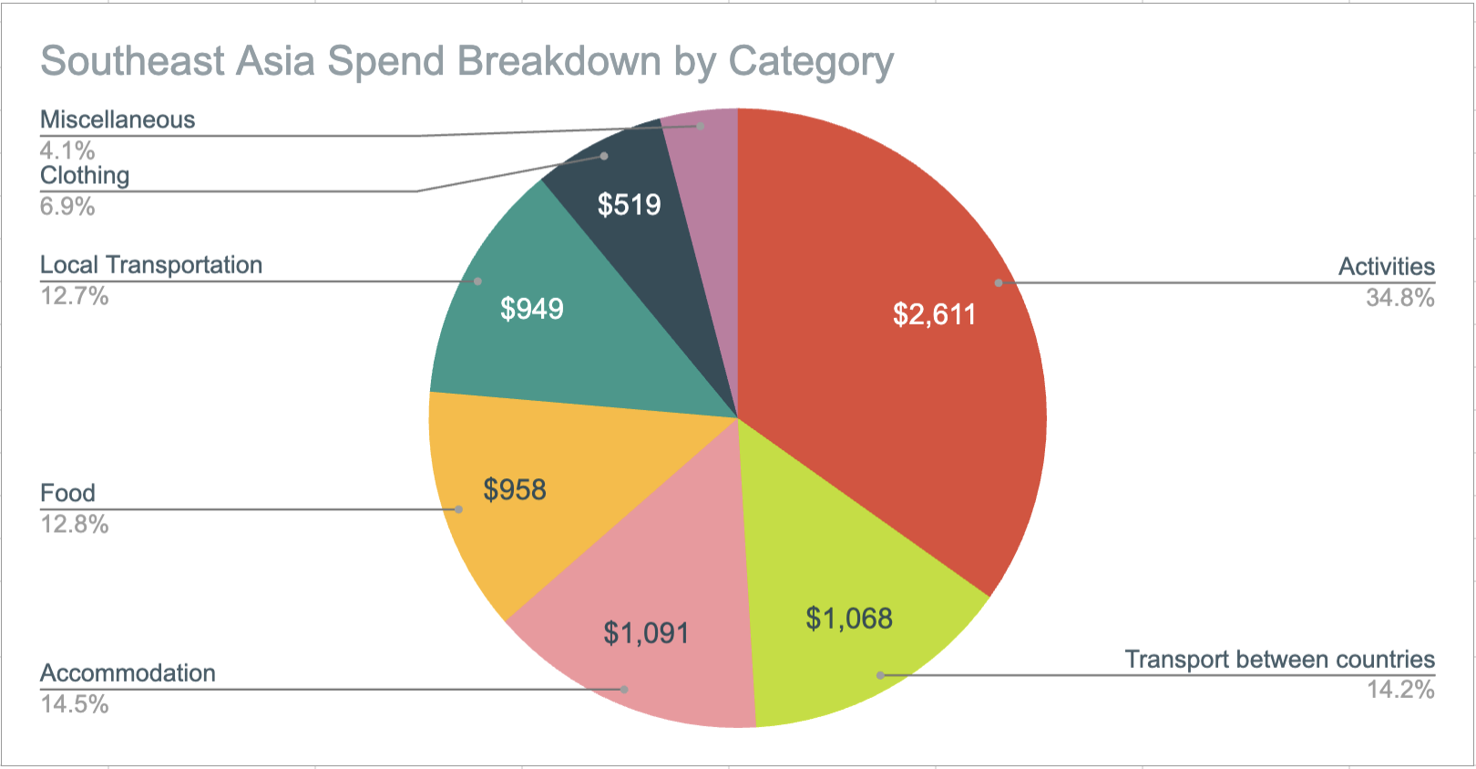 In full transparency, my parents kindly paid for Fiji, NZ, Australia, & Japan since I was with them for those four countries (very, very lucky!!) so this analysis will cover roughly 21 months (as the aforementioned countries were essentially free). This does include any spend I had while in CA, which is usually cheaper than traveling as I have no accommodation costs while at home.