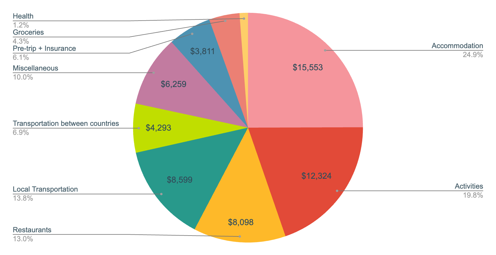 This shows a breakdown of the total spend by trip segment. Obviously Europe would be the highest since that was the longest segment of the trip so far. Pre-trip expenses include: clothes, Workaway membership, initial flights, & electronics. Health insurance for the duration of the trip was $170 per month ($2,040 for the year). Scuba diving really drove up costs in Central America.